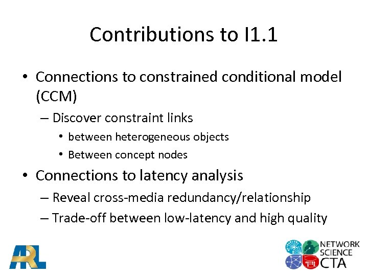 Contributions to I 1. 1 • Connections to constrained conditional model (CCM) – Discover constraint links • between heterogeneous objects • Between concept nodes • Connections to latency analysis – Reveal cross-media redundancy/relationship – Trade-off between low-latency and high quality