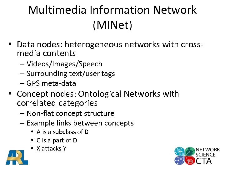 Multimedia Information Network (MINet) • Data nodes: heterogeneous networks with crossmedia contents – Videos/Images/Speech – Surrounding text/user tags – GPS meta-data • Concept nodes: Ontological Networks with correlated categories – Non-flat concept structure – Example links between concepts • A is a subclass of B • C is a part of D • X attacks Y