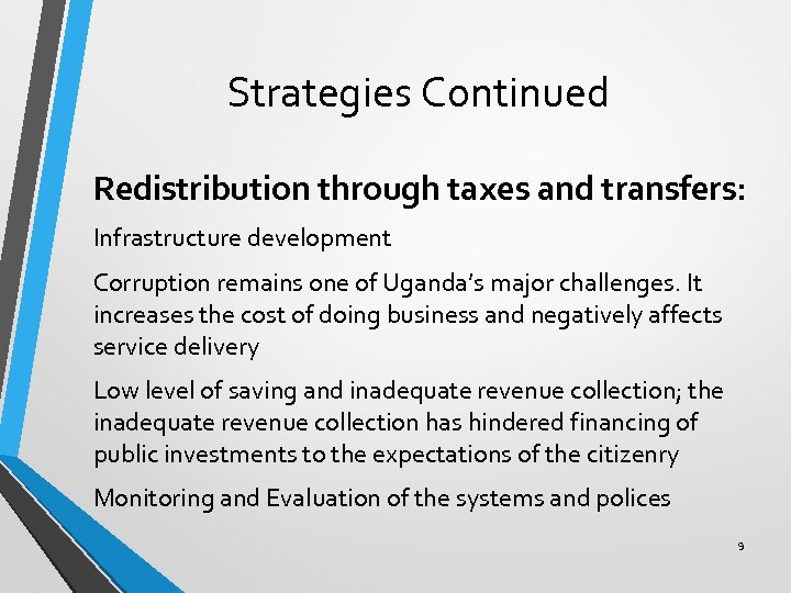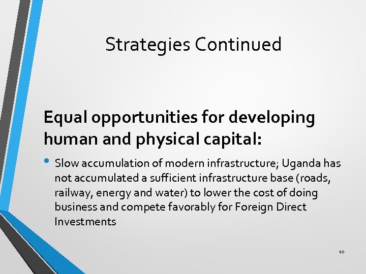 Strategies Continued Redistribution through taxes and transfers: Infrastructure development Corruption remains one of Uganda’s major challenges. It increases the cost of doing business and negatively affects service delivery Low level of saving and inadequate revenue collection; the inadequate revenue collection has hindered financing of public investments to the expectations of the citizenry Monitoring and Evaluation of the systems and polices 9