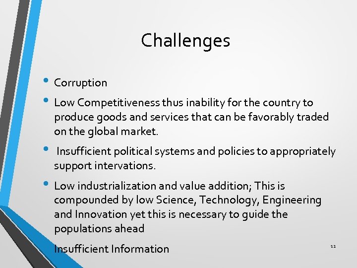 Challenges • Corruption • Low Competitiveness thus inability for the country to produce goods and services that can be favorably traded on the global market. • Insufficient political systems and policies to appropriately support intervations. • Low industrialization and value addition; This is compounded by low Science, Technology, Engineering and Innovation yet this is necessary to guide the populations ahead • Insufficient Information 12