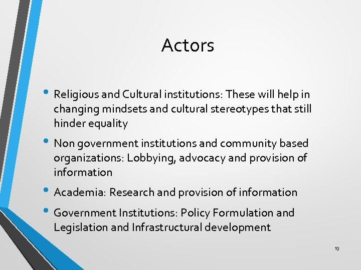 Actors • Religious and Cultural institutions: These will help in changing mindsets and cultural stereotypes that still hinder equality • Non government institutions and community based organizations: Lobbying, advocacy and provision of information • Academia: Research and provision of information • Government Institutions: Policy Formulation and Legislation and Infrastructural development • 13