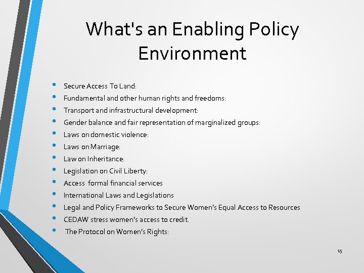 What's an Enabling Policy Environment • • • • Secure Access To Land: Fundamental and other human rights and freedoms: Transport and infrastructural development: Gender balance and fair representation of marginalized groups: Laws on domestic violence: Laws on Marriage: Law on Inheritance: Legislation on Civil Liberty: Access formal financial services International Laws and Legislations Legal and Policy Frameworks to Secure Women’s Equal Access to Resources CEDAW stress women’s access to credit. The Protocol on Women’s Rights: 15