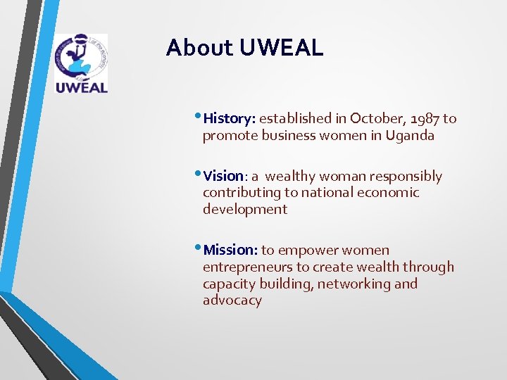 About UWEAL • History: established in October, 1987 to promote business women in Uganda • Vision: a wealthy woman responsibly contributing to national economic development • Mission: to empower women entrepreneurs to create wealth through capacity building, networking and advocacy