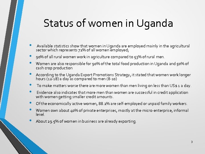 Status of women in Uganda • • • Available statistics show that women in Uganda are employed mainly in the agricultural sector which represents 72% of all women employed; 90% of all rural women work in agriculture compared to 53% of rural men. Women are also responsible for 90% of the total food production in Uganda and 50% of cash crop production According to the Uganda Export Promotions Strategy, it stated that women work longer hours (12 -18) a day as compared to men (8 -10) To make matters worse there are more women than men living on less than US$ 1 a day. Evidence also indicates that more men than women are successful in credit application with women getting smaller credit amounts. Of the economically active women, 88. 2% are self-employed or unpaid family workers. Women own about 40% of private enterprises, mostly at the micro-enterprise, informal level. About 29. 5% of women in business are already exporting. 3