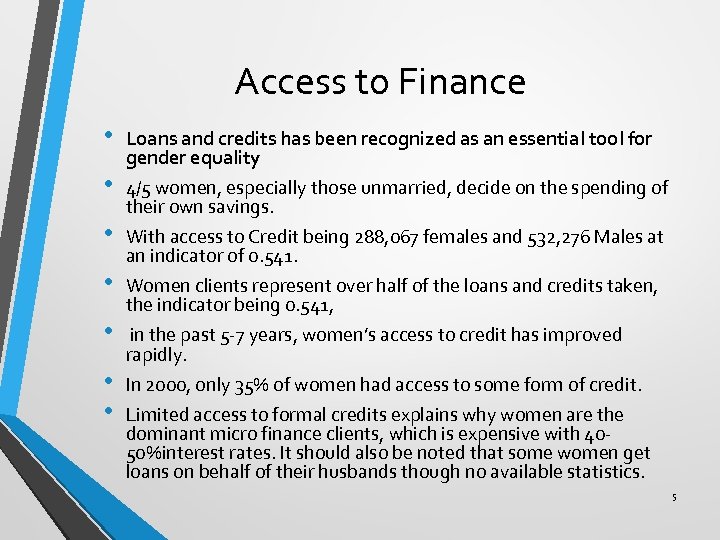 Access to Finance • • Loans and credits has been recognized as an essential tool for gender equality 4/5 women, especially those unmarried, decide on the spending of their own savings. With access to Credit being 288, 067 females and 532, 276 Males at an indicator of 0. 541. Women clients represent over half of the loans and credits taken, the indicator being 0. 541, in the past 5 -7 years, women’s access to credit has improved rapidly. In 2000, only 35% of women had access to some form of credit. Limited access to formal credits explains why women are the dominant micro finance clients, which is expensive with 4050%interest rates. It should also be noted that some women get loans on behalf of their husbands though no available statistics. 5