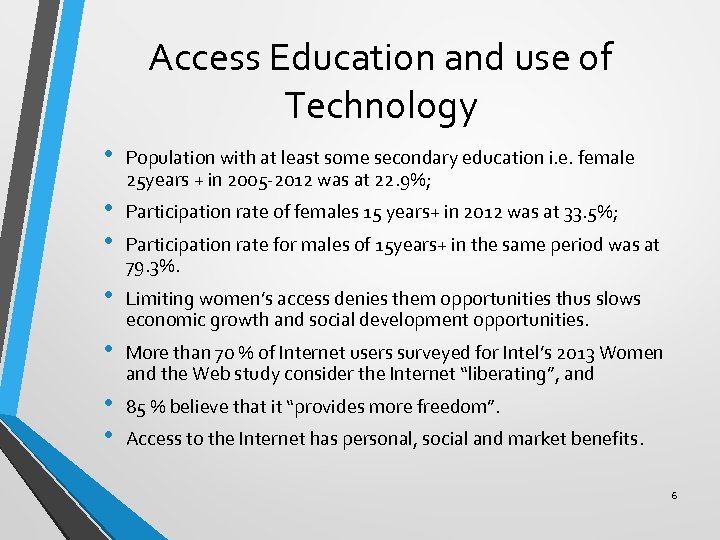 Access Education and use of Technology • Population with at least some secondary education i. e. female 25 years + in 2005 -2012 was at 22. 9%; • • Participation rate of females 15 years+ in 2012 was at 33. 5%; • Limiting women’s access denies them opportunities thus slows economic growth and social development opportunities. • More than 70 % of Internet users surveyed for Intel’s 2013 Women and the Web study consider the Internet “liberating”, and • • 85 % believe that it “provides more freedom”. Participation rate for males of 15 years+ in the same period was at 79. 3%. Access to the Internet has personal, social and market benefits. 6