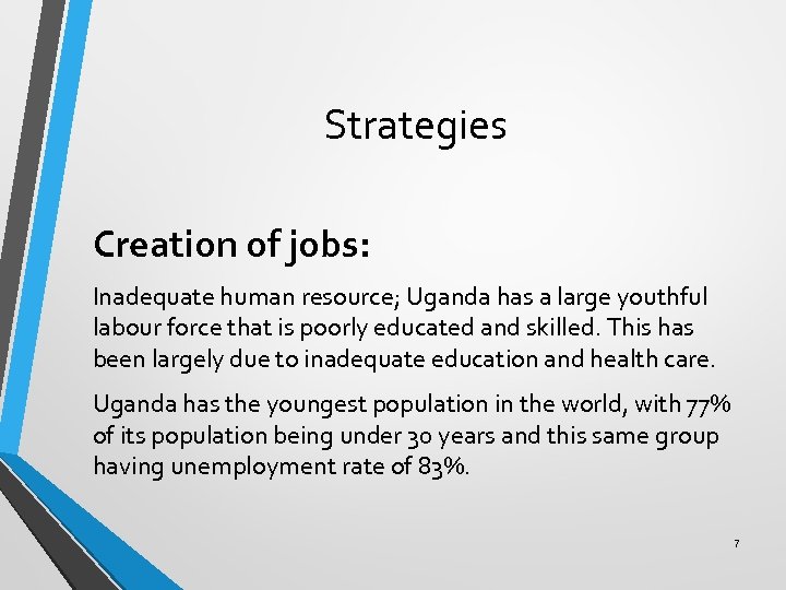 Strategies Creation of jobs: Inadequate human resource; Uganda has a large youthful labour force that is poorly educated and skilled. This has been largely due to inadequate education and health care. Uganda has the youngest population in the world, with 77% of its population being under 30 years and this same group having unemployment rate of 83%. 7
