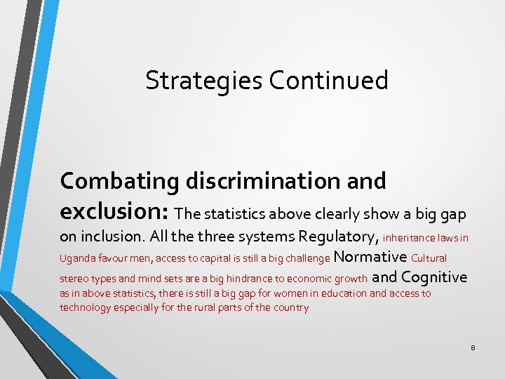 Strategies Continued Combating discrimination and exclusion: The statistics above clearly show a big gap on inclusion. All the three systems Regulatory, inheritance laws in Uganda favour men, access to capital is still a big challenge Normative Cultural stereo types and mind sets are a big hindrance to economic growth and Cognitive as in above statistics, there is still a big gap for women in education and access to technology especially for the rural parts of the country 8