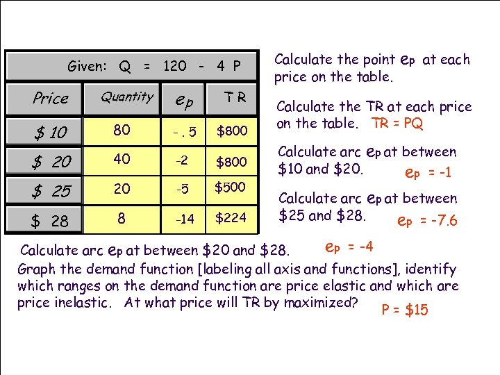 Given: Q = 120 - 4 P Price Quantity ep TR $ 10 80 -. 5 $800 $ 20 40 -2 $800 $ 25 20 -5 $500 $ 28 8 -14 $224 Calculate the point price on the table. ep at each Calculate the TR at each price on the table. TR = PQ Calculate arc ep at between $10 and $20. ep = -1 Calculate arc ep at between $25 and $28. ep = -7. 6 ep = -4 Calculate arc ep at between $20 and $28. Graph the demand function [labeling all axis and functions], identify which ranges on the demand function are price elastic and which are price inelastic. At what price will TR by maximized? P = $15