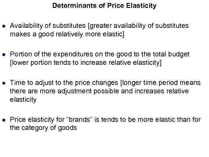 Determinants of Price Elasticity l Income Elasticity (Normal Goods) Availability of substitutes [greater availability of substitutes makes a good relatively more elastic] l Portion of the expenditures on the good to the total budget [lower portion tends to increase relative elasticity] l Time to adjust to the price changes [longer time period means there are more adjustment possible and increases relative elasticity l Price elasticity for “brands” is tends to be more elastic than for the category of goods