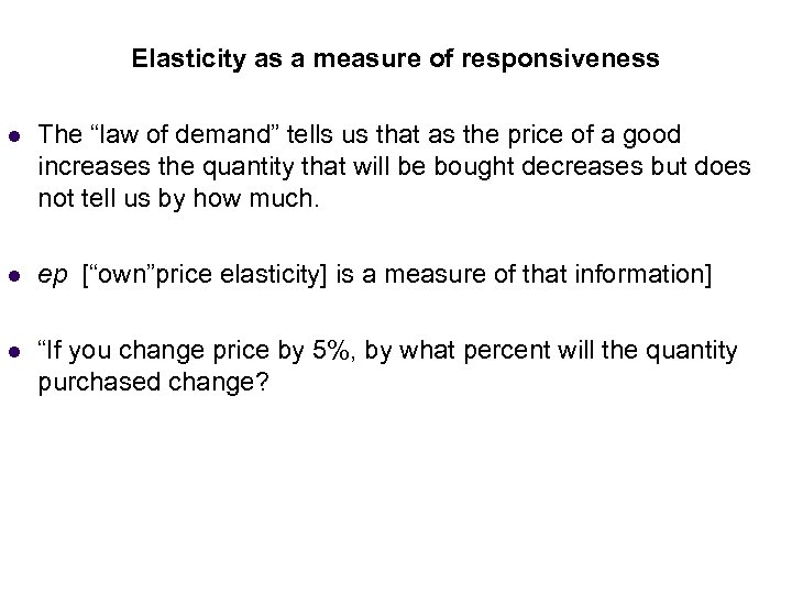 Income Elasticity as a measure of responsiveness (Normal Goods) l The “law of demand” tells us that as the price of a good increases the quantity that will be bought decreases but does not tell us by how much. l ep [“own”price elasticity] is a measure of that information] l “If you change price by 5%, by what percent will the quantity purchased change?