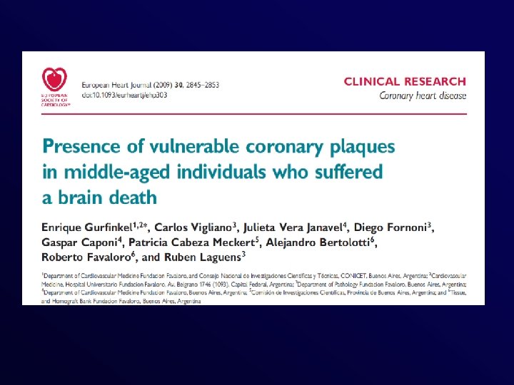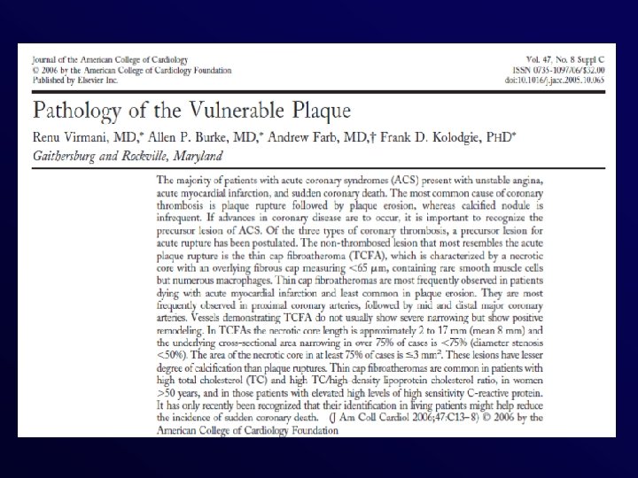 The vulnerable plaque hypothesis • Most myocardial infarctions originate from lesions that are not severely narrowed • There are specific characteristics of a plaque prone to fissuration /disruption / erosion and leading to ACS • The identification of these lesions prior to ACS may promote their treatment by PCI thus preventing the complications