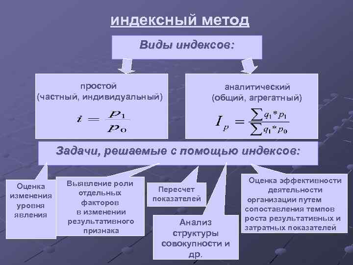 индексный метод Виды индексов: простой (частный, индивидуальный) аналитический (общий, агрегатный) Задачи, решаемые с помощью индексов: Оценка изменения уровня явления Выявление роли отдельных факторов в изменении результативного признака Пересчет показателей Анализ структуры совокупности и др. Оценка эффективности деятельности организации путем сопоставления темпов роста результативных и затратных показателей