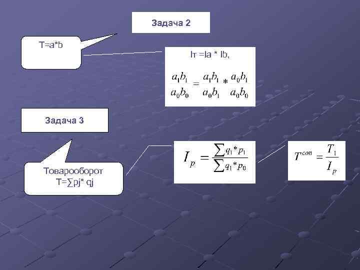 Задача 2 Т=а*b Задача 3 Товарооборот Т=∑pj* qj Iт =Ia * Ib,