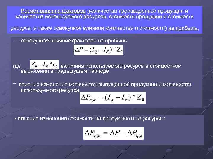 Расчет влияния факторов (количества произведенной продукции и количества используемого ресурсов, стоимости продукции и стоимости ресурса, а также совокупное влияния количества и стоимости) на прибыль. - совокупное влияние факторов на прибыль: где величина используемого ресурса в стоимостном выражении в предыдущем периоде. - влияние изменения количества выпущенной продукции и количества используемого ресурса: - влияние изменения стоимости на продукцию и на ресурсы: