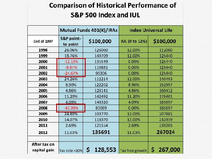 IUL too expensive? Case I 40 Years old Male, Preferred plus rate class, 500 K face amount From Age 40 -80, total 40 years, IUL Cost total: $5, 252 + $4, 800 + $14, 625 + $26, 602 = $41, 279 Annual average cost : $1, 032 Case II 40 Years old Male, Preferred plus rate class, 500 K face amount From Age 40 -80, total 40 years, Term 20 years + 20 years Cost total: $8, 160 + $51, 160 = $59, 320 Annual average cost : $1, 483, Actually $2, 100