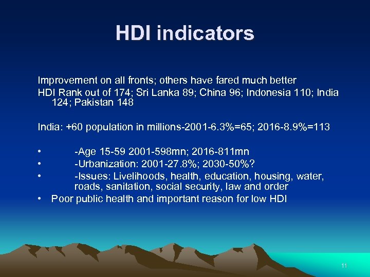 HDI indicators Improvement on all fronts; others have fared much better HDI Rank out of 174; Sri Lanka 89; China 96; Indonesia 110; India 124; Pakistan 148 India: +60 population in millions-2001 -6. 3%=65; 2016 -8. 9%=113 • • • -Age 15 -59 2001 -598 mn; 2016 -811 mn -Urbanization: 2001 -27. 8%; 2030 -50%? -Issues: Livelihoods, health, education, housing, water, roads, sanitation, social security, law and order • Poor public health and important reason for low HDI 11