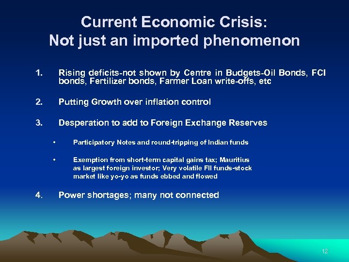 Current Economic Crisis: Not just an imported phenomenon 1. Rising deficits-not shown by Centre in Budgets-Oil Bonds, FCI bonds, Fertilizer bonds, Farmer Loan write-offs, etc 2. Putting Growth over inflation control 3. Desperation to add to Foreign Exchange Reserves • • 4. Participatory Notes and round-tripping of Indian funds Exemption from short-term capital gains tax; Mauritius as largest foreign investor; Very volatile FII funds-stock market like yo-yo as funds ebbed and flowed Power shortages; many not connected 12