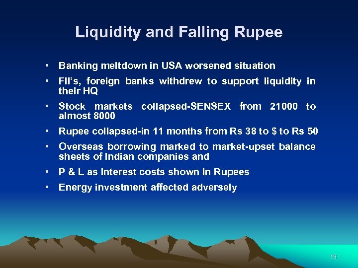 Liquidity and Falling Rupee • Banking meltdown in USA worsened situation • FII’s, foreign banks withdrew to support liquidity in their HQ • Stock markets collapsed-SENSEX from 21000 to almost 8000 • Rupee collapsed-in 11 months from Rs 38 to $ to Rs 50 • Overseas borrowing marked to market-upset balance sheets of Indian companies and • P & L as interest costs shown in Rupees • Energy investment affected adversely 13