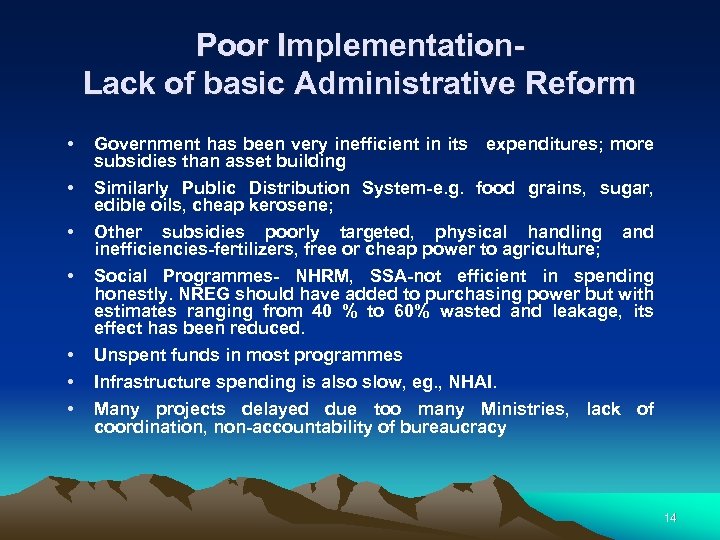 Poor Implementation. Lack of basic Administrative Reform • Government has been very inefficient in its expenditures; more subsidies than asset building • Similarly Public Distribution System-e. g. food grains, sugar, edible oils, cheap kerosene; • Other subsidies poorly targeted, physical handling and inefficiencies-fertilizers, free or cheap power to agriculture; Social Programmes- NHRM, SSA-not efficient in spending honestly. NREG should have added to purchasing power but with estimates ranging from 40 % to 60% wasted and leakage, its effect has been reduced. Unspent funds in most programmes Infrastructure spending is also slow, eg. , NHAI. Many projects delayed due too many Ministries, lack of coordination, non-accountability of bureaucracy • • 14
