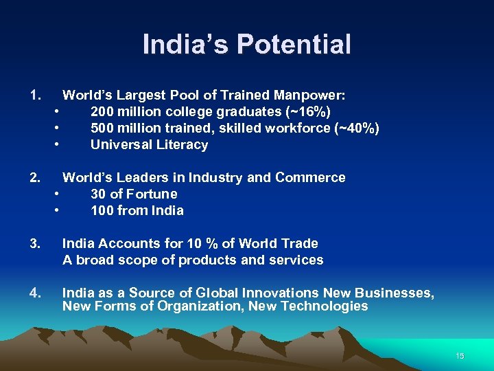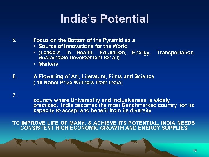 India’s Potential 1. World’s Largest Pool of Trained Manpower: • 200 million college graduates (~16%) • 500 million trained, skilled workforce (~40%) • Universal Literacy 2. World’s Leaders in Industry and Commerce • 30 of Fortune • 100 from India 3. India Accounts for 10 % of World Trade A broad scope of products and services 4. India as a Source of Global Innovations New Businesses, New Forms of Organization, New Technologies 15