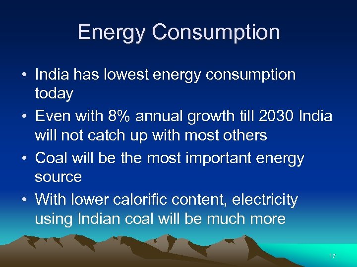 India’s Potential 5. 6. 7. Focus on the Bottom of the Pyramid as a • Source of Innovations for the World • (Leaders in Health, Education, Energy, Sustainable Development for all) • Markets Transportation, A Flowering of Art, Literature, Films and Science ( 10 Nobel Prize Winners from India) country where Universality and Inclusiveness is widely practiced. India becomes the most Benchmarked country for its capacity to accept and benefit from its diversity TO IMPROVE LIFE OF MANY, & ACHIEVE ITS POTENTIAL, INDIA NEEDS CONSISTENT HIGH ECONOMIC GROWTH AND ENERGY SUPPLIES 16