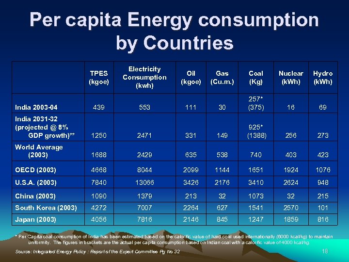 Per capita Energy consumption by Countries India 2003 -04 TPES (kgoe) 439 Electricity Consumption (kwh) 553 Oil (kgoe) 111 Gas (Cu. m. ) Coal (Kg) Nuclear (k. Wh) Hydro (k. Wh) 30 257* (375) 16 69 256 273 India 2031 -32 (projected @ 8% GDP growth)** 1250 2471 331 149 925* (1388) World Average (2003) 1688 2429 635 538 740 403 423 OECD (2003) 4668 8044 2099 1144 1651 1924 1076 U. S. A. (2003) 7840 13066 3426 2176 3410 2624 948 China (2003) 1090 1379 213 32 1073 32 215 South Korea (2003) 4272 7007 2264 627 1541 2570 101 Japan (2003) 4056 7816 2146 845 1247 1859 816 * Per Capita coal consumption of India has been estimated based on the calorific value of hard coal used internationally (6000 kcal/kg) to maintain uniformity. The figures in brackets are the actual per capita consumption based on Indian coal with a calorific value of 4000 kcal/kg. Source: Integrated Energy Policy : Report of the Expert Committee Pg No 32 18