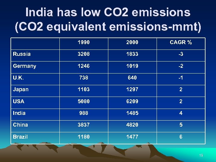 India has low CO 2 emissions (CO 2 equivalent emissions-mmt) 1990 2000 CAGR % Russia 3208 1833 -3 Germany 1246 1019 -2 U. K. 738 640 -1 Japan 1103 1297 2 USA 5080 6209 2 India 988 1485 4 China 3837 4820 5 Brazil 1180 1477 6 19