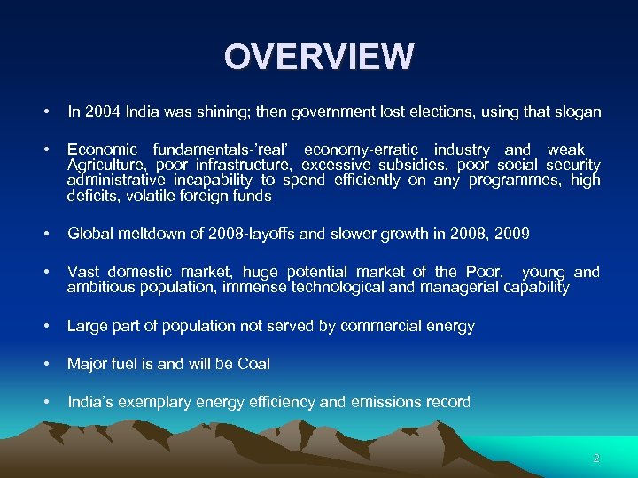 OVERVIEW • In 2004 India was shining; then government lost elections, using that slogan • Economic fundamentals-’real’ economy-erratic industry and weak Agriculture, poor infrastructure, excessive subsidies, poor social security administrative incapability to spend efficiently on any programmes, high deficits, volatile foreign funds • Global meltdown of 2008 -layoffs and slower growth in 2008, 2009 • Vast domestic market, huge potential market of the Poor, young and ambitious population, immense technological and managerial capability • Large part of population not served by commercial energy • Major fuel is and will be Coal • India’s exemplary energy efficiency and emissions record 2