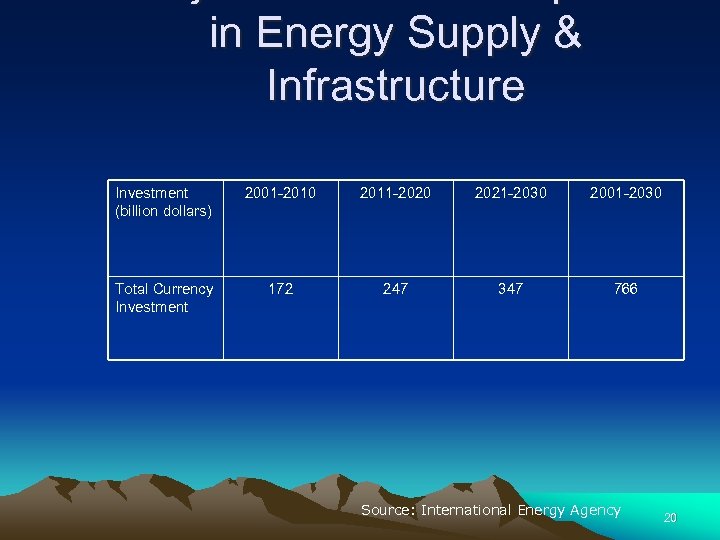 in Energy Supply & Infrastructure Investment (billion dollars) 2001 -2010 2011 -2020 2021 -2030 2001 -2030 Total Currency Investment 172 247 347 766 Source: International Energy Agency 20