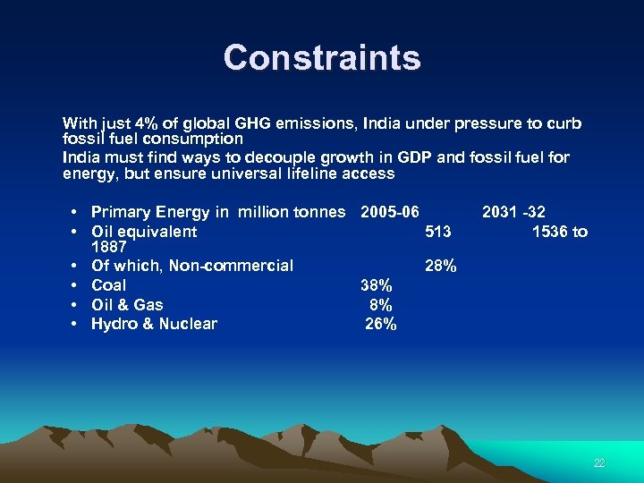 Constraints With just 4% of global GHG emissions, India under pressure to curb fossil fuel consumption India must find ways to decouple growth in GDP and fossil fuel for energy, but ensure universal lifeline access • Primary Energy in million tonnes 2005 -06 • Oil equivalent 513 1887 • Of which, Non-commercial 28% • Coal 38% • Oil & Gas 8% • Hydro & Nuclear 26% 2031 -32 1536 to 22