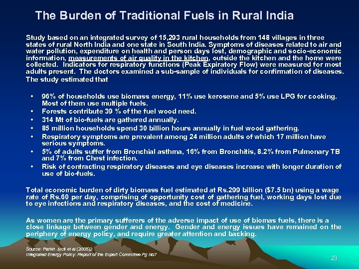 The Burden of Traditional Fuels in Rural India Study based on an integrated survey of 15, 293 rural households from 148 villages in three states of rural North India and one state in South India. Symptoms of diseases related to air and water pollution, expenditure on health and person days lost, demographic and socio-economic information, measurements of air quality in the kitchen, outside the kitchen and the home were collected. Indicators for respiratory functions (Peak Expiratory Flow) were measured for most adults present. The doctors examined a sub-sample of individuals for confirmation of diseases. The study estimated that • • 96% of households use biomass energy, 11% use kerosene and 5% use LPG for cooking. Most of them use multiple fuels. Forests contribute 39 % of the fuel wood need. 314 Mt of bio-fuels are gathered annually. 85 million households spend 30 billion hours annually in fuel wood gathering. Respiratory symptoms are prevalent among 24 million adults of which 17 million have serious symptoms. 5% of adults suffer from Bronchial asthma, 16% from Bronchitis, 8. 2% from Pulmonary TB and 7% from Chest infection. Risk of contracting respiratory diseases and eye diseases increase with longer duration of use of bio-fuels. Total economic burden of dirty biomass fuel estimated at Rs. 299 billion ($7. 5 bn) using a wage rate of Rs. 60 per day, comprising of opportunity cost of gathering fuel, working days lost due to eye infections and respiratory diseases, and the cost of medicine. As women are the primary sufferers of the adverse impact of use of biomas fuels, there is a close linkage between gender and energy. Gender and energy issues have remained on the periphery of energy policy, and require greater attention and backing. Source: Parikh Jyoti et al (2005)2 Integrated Energy Policy: Report of the Expert Committee Pg No 7 23