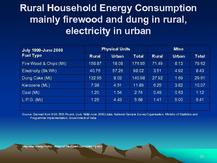 Rural Household Energy Consumption mainly firewood and dung in rural, electricity in urban Physical Units Mtoe July 1999 -June 2000 Fuel Type Rural Urban Total Fire Wood & Chips (Mt) 158. 87 18. 08 176. 95 71. 49 8. 13 79. 62 Electricity (Bk Wh) 40. 76 57. 26 98. 02 3. 51 4. 92 8. 43 Dung Cake (Mt) 132. 95 8. 03 140. 98 27. 92 1. 69 29. 61 Kerosene (ML) 7. 38 4. 51 11. 89 6. 25 3. 82 10. 07 Coal (Mt) 1. 20 1. 54 2. 74 0. 49 0. 63 1. 12 L. P. G. (Mt) 1. 25 4. 43 5. 68 1. 41 5. 00 6. 41 Source: Derived from NSS 55 th Round, (July 1999 -June 2000) data, National Sample Survey rganisation, Ministry of Statistics and O Programme Implementation, Government of India Integrated Energy Policy : Report of the Expert Committee Pg No 8 24
