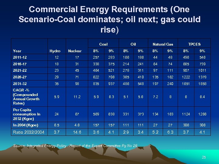Commercial Energy Requirements (One Scenario-Coal dominates; oil next; gas could rise) Coal Year Hydro Nuclear Oil Natural Gas TPCES 8% 9% 2011 -12 12 17 257 283 166 186 44 48 496 546 2016 -17 18 31 338 375 214 241 64 74 665 739 2021 -22 23 45 464 521 278 311 97 111 907 1011 2026 -27 29 71 622 706 365 410 135 162 1222 1378 2031 -32 35 98 835 937 486 548 197 240 1651 1858 CAGR -% (Compounded Annual Growth Rates) 5. 9 11. 2 5. 9 6. 3 5. 1 5. 6 7. 2 8 6 6. 4 Per Capita consumption In 2032 (Kgoe) 24 67 569 638 331 373 134 163 1124 1266 In 2004 (Kgoe) 6. 5 4. 6 157 111 27 27 306 Ratio 2032/2004 3. 7 14. 6 3. 6 4. 1 2. 9 3. 4 5. 2 6. 3 3. 7 4. 1 Source: Integrated Energy Policy : Report of the Expert Committee Pg No 28 25