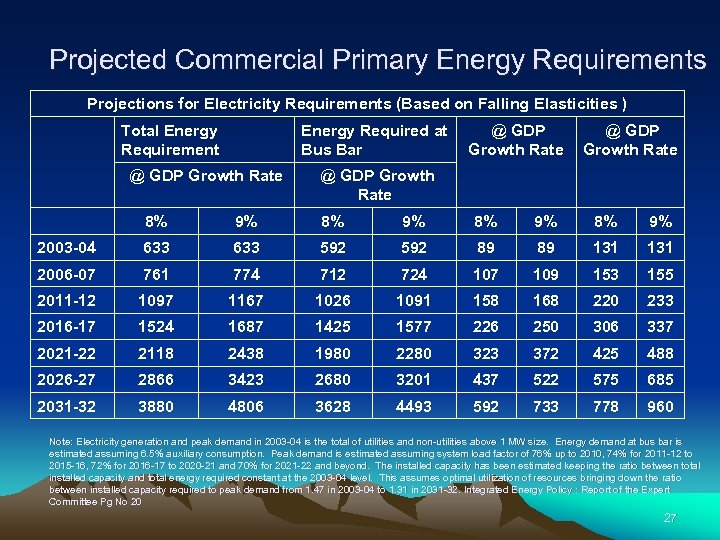 Projected Commercial Primary Energy Requirements Projections for Electricity Requirements (Based on Falling Elasticities ) Total Energy Requirement Energy Required at Bus Bar @ GDP Growth Rate 8% 9% 2003 -04 633 592 89 89 131 2006 -07 761 774 712 724 107 109 153 155 2011 -12 1097 1167 1026 1091 158 168 220 233 2016 -17 1524 1687 1425 1577 226 250 306 337 2021 -22 2118 2438 1980 2280 323 372 425 488 2026 -27 2866 3423 2680 3201 437 522 575 685 2031 -32 3880 4806 3628 4493 592 733 778 960 Note: Electricity generation and peak demand in 2003 -04 is the total of utilities and non-utilities above 1 MW size. Energy demand at bus bar is estimated assuming 6. 5% auxiliary consumption. Peak demand is estimated assuming system load factor of 76% up to 2010, 74% for 2011 -12 to 2015 -16, 72% for 2016 -17 to 2020 -21 and 70% for 2021 -22 and beyond. The installed capacity has been estimated keeping the ratio between total installed capacity and total energy required constant at the 2003 -04 level. This assumes optimal utilization of resources bringing down the ratio between installed capacity required to peak demand from 1. 47 in 2003 -04 to 1. 31 in 2031 -32. Integrated Energy Policy : Report of the Expert Committee Pg No 20 27
