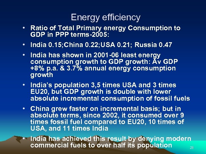 Energy efficiency • Ratio of Total Primary energy Consumption to GDP in PPP terms-2005: • India 0. 15; China 0. 22; USA 0. 21; Russia 0. 47 • India has shown in 2001 -06 least energy consumption growth to GDP growth: Av GDP +8% p. a. & 3. 7% annual energy consumption growth • India’s population 3, 5 times USA and 3 times EU 20, but GDP growth is double with lower absolute incremental consumption of fossil fuels • China grew faster on incremental basis; but in absolute terms, since 2002, it consumed over 9 times fossil fuel compared to EU 20, 10 times of USA, and 11 times India • India has achieved this result by denying modern commercial fuels to over half its population 28