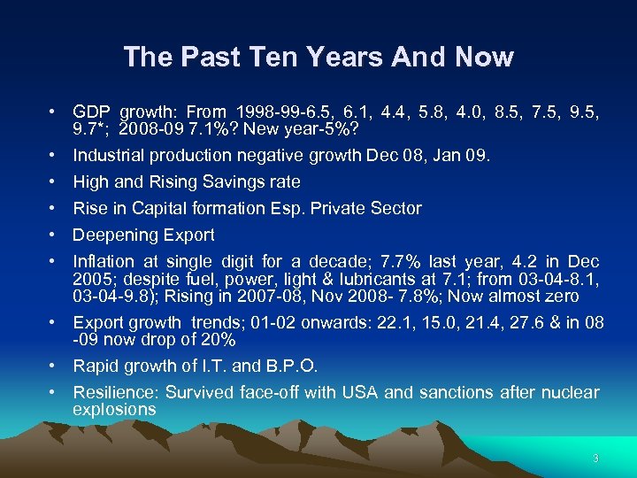 The Past Ten Years And Now • GDP growth: From 1998 -99 -6. 5, 6. 1, 4. 4, 5. 8, 4. 0, 8. 5, 7. 5, 9. 7*; 2008 -09 7. 1%? New year-5%? • Industrial production negative growth Dec 08, Jan 09. • High and Rising Savings rate • Rise in Capital formation Esp. Private Sector • Deepening Export • Inflation at single digit for a decade; 7. 7% last year, 4. 2 in Dec 2005; despite fuel, power, light & lubricants at 7. 1; from 03 -04 -8. 1, 03 -04 -9. 8); Rising in 2007 -08, Nov 2008 - 7. 8%; Now almost zero • Export growth trends; 01 -02 onwards: 22. 1, 15. 0, 21. 4, 27. 6 & in 08 -09 now drop of 20% • Rapid growth of I. T. and B. P. O. • Resilience: Survived face-off with USA and sanctions after nuclear explosions 3