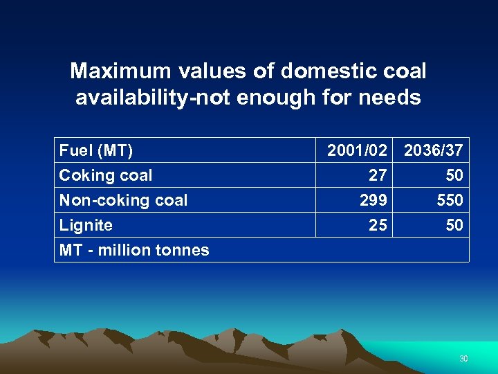 Maximum values of domestic coal availability-not enough for needs Fuel (MT) Coking coal Non-coking coal Lignite 2001/02 27 299 25 2036/37 50 50 MT - million tonnes 30