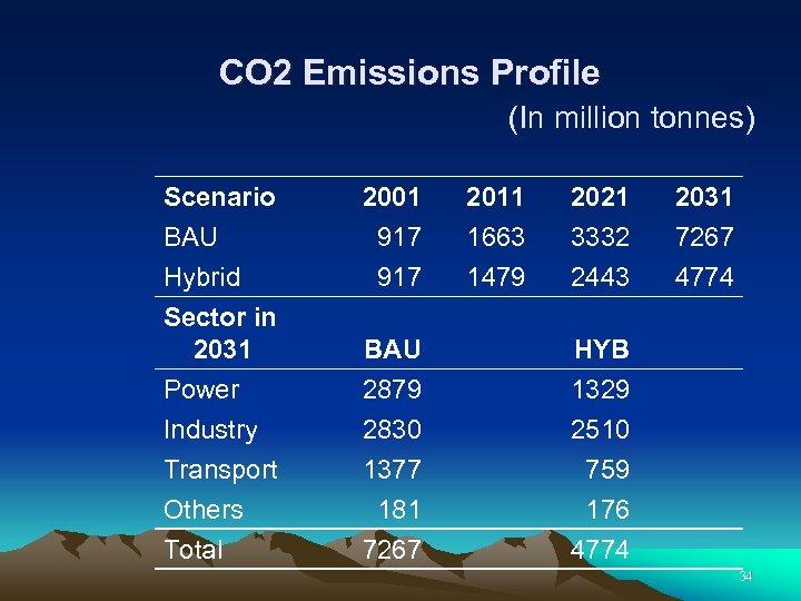 CO 2 Emissions Profile (In million tonnes) Scenario BAU Hybrid Sector in 2031 2001 917 2011 1663 1479 2021 3332 2443 BAU HYB Power Industry Transport Others Total 2879 2830 1377 181 7267 2031 7267 4774 1329 2510 759 176 4774 34