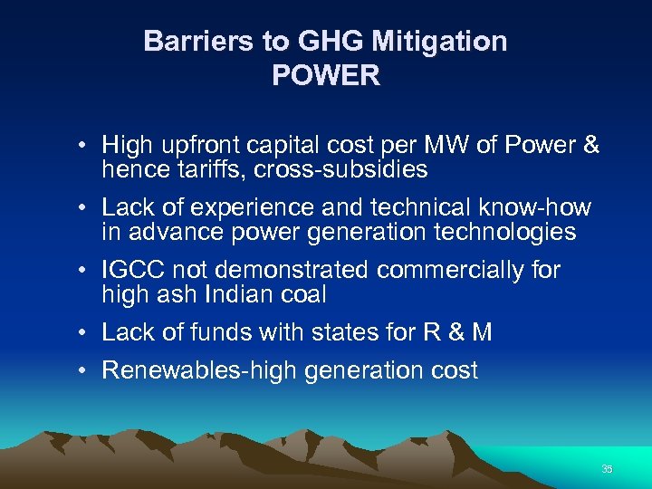 Barriers to GHG Mitigation POWER • High upfront capital cost per MW of Power & hence tariffs, cross-subsidies • Lack of experience and technical know-how in advance power generation technologies • IGCC not demonstrated commercially for high ash Indian coal • Lack of funds with states for R & M • Renewables-high generation cost 35