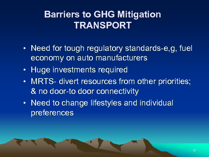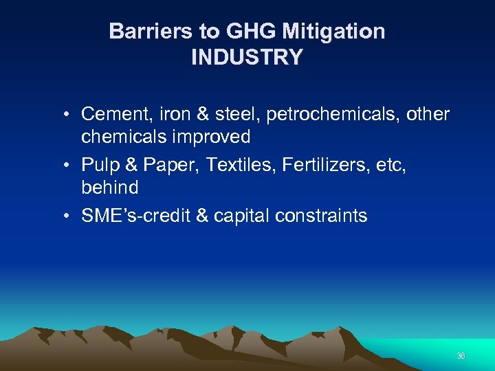 Barriers to GHG Mitigation INDUSTRY • Cement, iron & steel, petrochemicals, other chemicals improved • Pulp & Paper, Textiles, Fertilizers, etc, behind • SME’s-credit & capital constraints 36