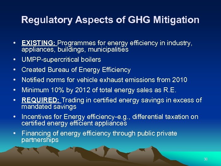 Barriers to GHG Mitigation TRANSPORT • Need for tough regulatory standards-e, g, fuel economy on auto manufacturers • Huge investments required • MRTS- divert resources from other priorities; & no door-to door connectivity • Need to change lifestyles and individual preferences 37