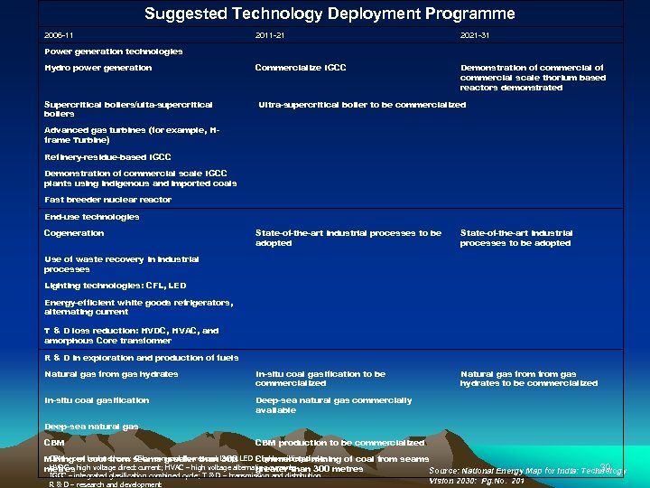 Suggested Technology Deployment Programme 2006 -11 2011 -21 Power generation technologies Hydro power generation 2021 -31 Commercialize IGCC Supercritical boilers/ulta-supercritical boilers Demonstration of commercial scale thorium based reactors demonstrated Ultra-supercritical boiler to be commercialized Advanced gas turbines (for example, Hframe Turbine) Refinery-residue-based IGCC Demonstration of commercial scale IGCC plants using indigenous and imported coals Fast breeder nuclear reactor State-of-the-art industrial processes to be adopted End-use technologies Cogeneration Use of waste recovery in industrial processes Lighting technologies: CFL, LED Energy-efficient white goods refrigerators, alternating current T & D loss reduction: HVDC, HVAC, and amorphous Core transformer Natural gas from gas hydrates In-situ coal gasification to be commercialized Natural gas from gas hydrates to be commercialized In-situ coal gasification Deep-sea natural gas commercially available R & D in exploration and production of fuels Deep-sea natural gas CBM production to be commercialized CBM – of cool from CFL – compact fluorescent 300 Miningcool bed methane: seams greater than lamp, LED – light emitting diode; Commercial mining of coal from seams HVDC – 39 metres high voltage direct current; HVAC – high voltage alternating current; greater than 300 metres Source: National Energy Map for India: Technology IGCC – integrated glasification combined cycle; T & D – transmission and distribution Vision 2030: Pg. No. 201 R & D – research and development