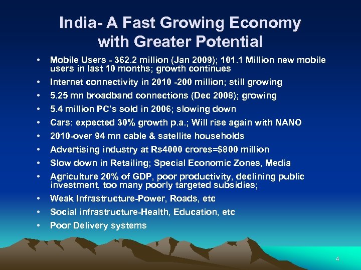 India- A Fast Growing Economy with Greater Potential • Mobile Users - 362. 2 million (Jan 2009); 101. 1 Million new mobile users in last 10 months; growth continues • • Internet connectivity in 2010 -200 million; still growing • • • 5. 25 mn broadband connections (Dec 2008); growing 5. 4 million PC’s sold in 2006; slowing down Cars: expected 30% growth p. a. ; Will rise again with NANO 2010 -over 94 mn cable & satellite households Advertising industry at Rs 4000 crores=$800 million Slow down in Retailing; Special Economic Zones, Media Agriculture 20% of GDP, poor productivity, declining public investment, too many poorly targeted subsidies; Weak Infrastructure-Power, Roads, etc Social infrastructure-Health, Education, etc Poor Delivery systems 4