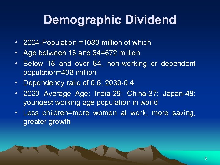 Demographic Dividend • 2004 -Population =1080 million of which • Age between 15 and 64=672 million • Below 15 and over 64, non-working or dependent population=408 million • Dependency ratio of 0. 6; 2030 -0. 4 • 2020 Average Age: India-29; China-37; Japan-48: youngest working age population in world • Less children=more women at work; more saving; greater growth 5