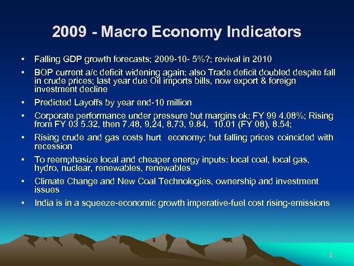 2009 - Macro Economy Indicators • • Falling GDP growth forecasts; 2009 -10 - 5%? ; revival in 2010 • • Predicted Layoffs by year end-10 million Corporate performance under pressure but margins ok: FY 99 4. 08%; Rising from FY 03 5. 32, then 7. 48, 9, 24, 8, 73, 9. 84, 10. 01 (FY 08), 8. 54; Rising crude and gas costs hurt economy; but falling prices coincided with recession To reemphasize local and cheaper energy inputs: local coal, local gas, hydro, nuclear, renewables Climate Change and New Coal Technologies, ownership and investment issues India is in a squeeze-economic growth imperative-fuel cost rising-emissions • • BOP current a/c deficit widening again; also Trade deficit doubled despite fall in crude prices; last year due Oil imports bills, now export & foreign investment decline 6