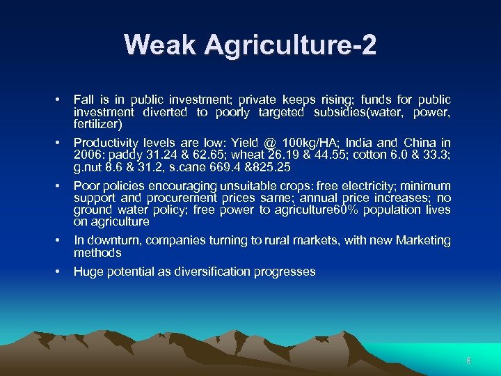 Weak Agriculture • • • Supports 60% of population Agriculture was 32% of GDP in 92 -93; 17% in 2008 -09 (AE) Agriculture growth or decline has direct effect on GDP; 97 GDP + 7. 8% Agriculture +8. 8; 04 - 8. 5 & A-9, 3 Static rice, erratic wheat, production: 08 07 06 05 00 91 81 (mn t) R 96 93 92 83 85 74 54 W 78 76 69 69 70 55 36 Land availability limited: Since 1980 crop area for food grains static at around 124 mn hectares Total Investment in Agriculture falling in 1990 s as % to GDP from 1. 92 in 90 -91; 1. 83 in 99 -00; 2006 -07 - 2. 3 % 7