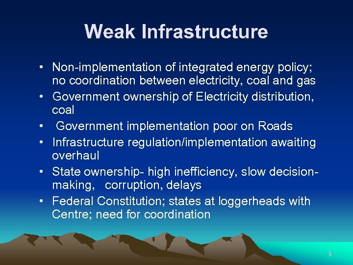 Weak Infrastructure • Non-implementation of integrated energy policy; no coordination between electricity, coal and gas • Government ownership of Electricity distribution, coal • Government implementation poor on Roads • Infrastructure regulation/implementation awaiting overhaul • State ownership- high inefficiency, slow decisionmaking, corruption, delays • Federal Constitution; states at loggerheads with Centre; need for coordination 9