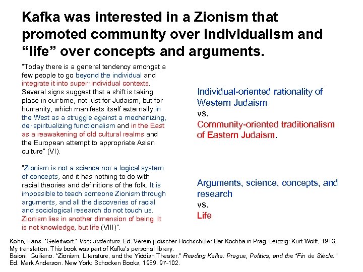 Kafka was interested in a Zionism that promoted community over individualism and “life” over concepts and arguments. “Today there is a general tendency amongst a few people to go beyond the individual and integrate it into super‑individual contexts. Several signs suggest that a shift is taking place in our time, not just for Judaism, but for humanity, which manifests itself externally in the West as a struggle against a mechanizing, de‑spiritualizing functionalism and in the East as a reawakening of old cultural realms and the European attempt to appropriate Asian culture” (VI). “Zionism is not a science nor a logical system of concepts, and it has nothing to do with racial theories and definitions of the folk. It is impossible to teach someone Zionism through arguments, and all the discoveries of racial and sociological research do not touch us. Zionism lies in another dimension of being. It is not knowledge, but life (VIII)”. Individual-oriented rationality of Western Judaism vs. Community-oriented traditionalism of Eastern Judaism. Arguments, science, concepts, and research vs. Life Kohn, Hans. “Geleitwort. ” Vom Judentum. Ed. Verein jüdischer Hochschüler Bar Kochba in Prag. Leipzig: Kurt Wolff, 1913. My translation. This book was part of Kafka’s personal library. Baioni, Guiliano. “Zionism, Literature, and the Yiddish Theater. ” Reading Kafka: Prague, Politics, and the “Fin de Siècle. ” Ed. Mark Anderson. New York: Schocken Books, 1989. 97 -102.