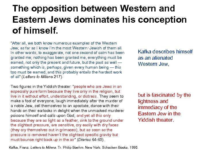 The opposition between Western and Eastern Jews dominates his conception of himself. “After all, we both know numerous examples of the Western Jew; as far as I know I’m the most Western‑Jewish of them all. In other words, to exaggerate, not one second of calm has been granted me; nothing has been granted me, everything must be earned, not only the present and future, but the past as well — something which is, perhaps, given every human being — this too must be earned, and this probably entails the hardest work of all” (Letters to Milena 217). Two figures in the Yiddish theater: “people who are Jews in an especially pure form because they live only in the religion, but live in it without effort, understanding, or distress. They seem to make a fool of everyone, laugh immediately after the murder of a noble Jew, sell themselves to an apostate, dance with their hands on their earlocks in delight when the unmasked murderer poisons himself and calls upon God, and yet all this only because they are as light as a feather, sink to the ground under the slightest pressure, are sensitive, cry easily with dry faces (they cry themselves out in grimaces), but as soon as the pressure is removed haven’t the slightest specific gravity but must bounce right back up in the air” (Diaries 64 -65). Kafka describes himself as an alienated Western Jew, but is fascinated by the lightness and immediacy of the Eastern Jew in the Yiddish theater. Kafka, Franz. Letters to Milena. Tr. Philip Boehm. New York: Schocken Books, 1990.
